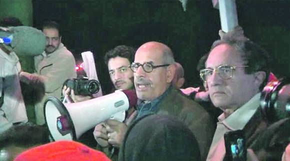 El Baradei, solicitando el apoyo de grupos de oposición, dijo que tenía un mandato para hablar con el ejército y organizar la formación de una coalición de unidad nacional. Llamó al presidente de EEUU, Barack Obama, a "cortar el soporte vital al dictador".