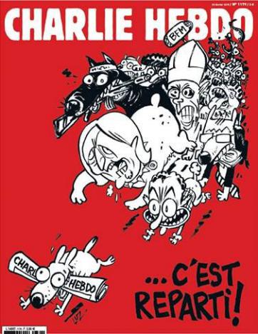 La nueva portada, concebida por la dibujante Luz -una de las sobrevivientes de la masacre-, enseña a un perro con el "Charlie Hebdo" entre sus dientes mientras huye de una jauría rabiosa encabezada por Sarkozy con forma de caniche y Le Pen encarnada en un pitbull.