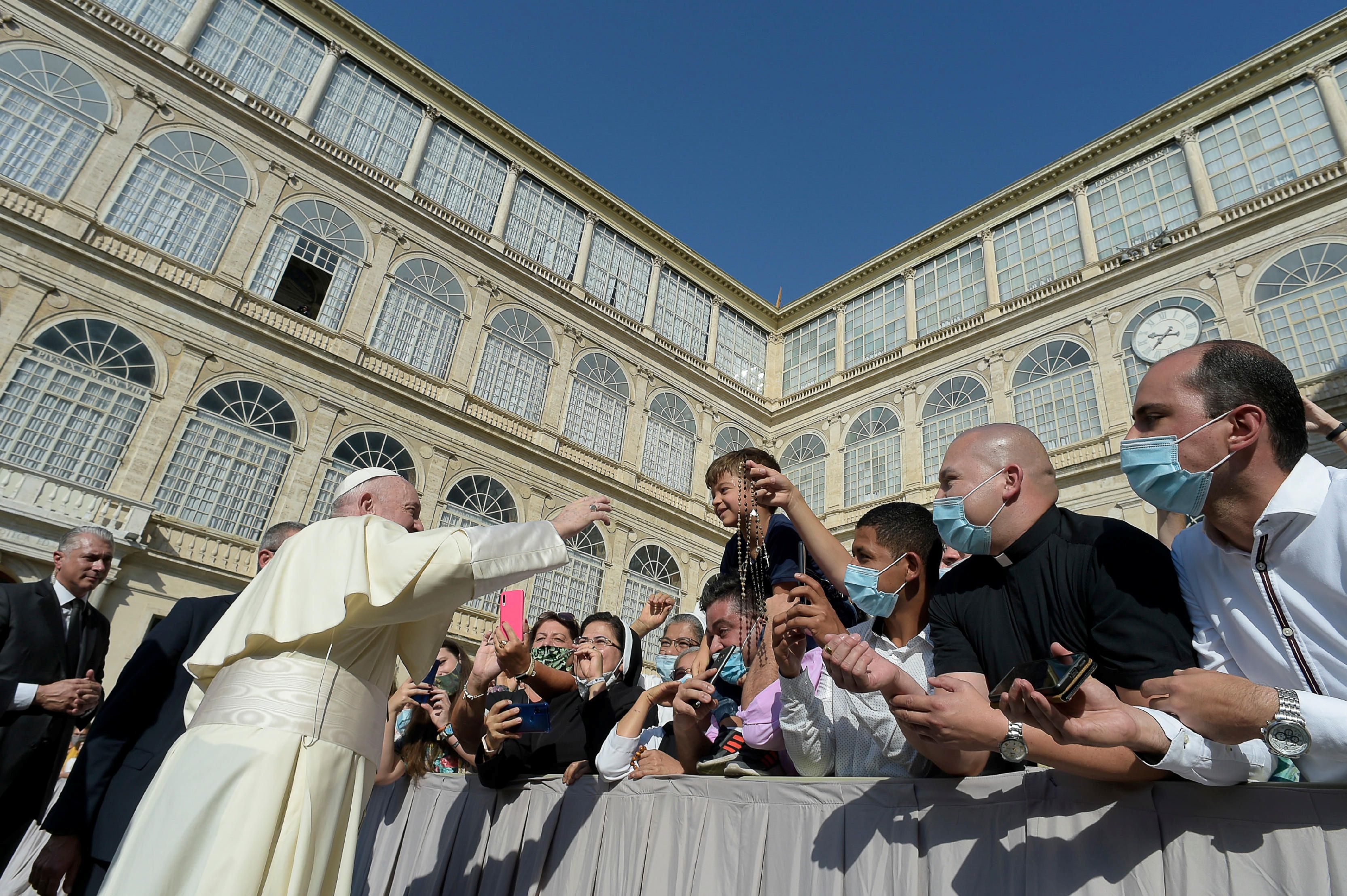 Después de seis meses de las tradicionales audiencias de los miércoles grabadas en directo en su biblioteca privada, el Sumo Pontífice reanudó en septiembre esta cita en presencia del público, pero limitando la multitud a 500 personas al aire libre en el patio de San Dámaso, en el interior del palacio pontificio.