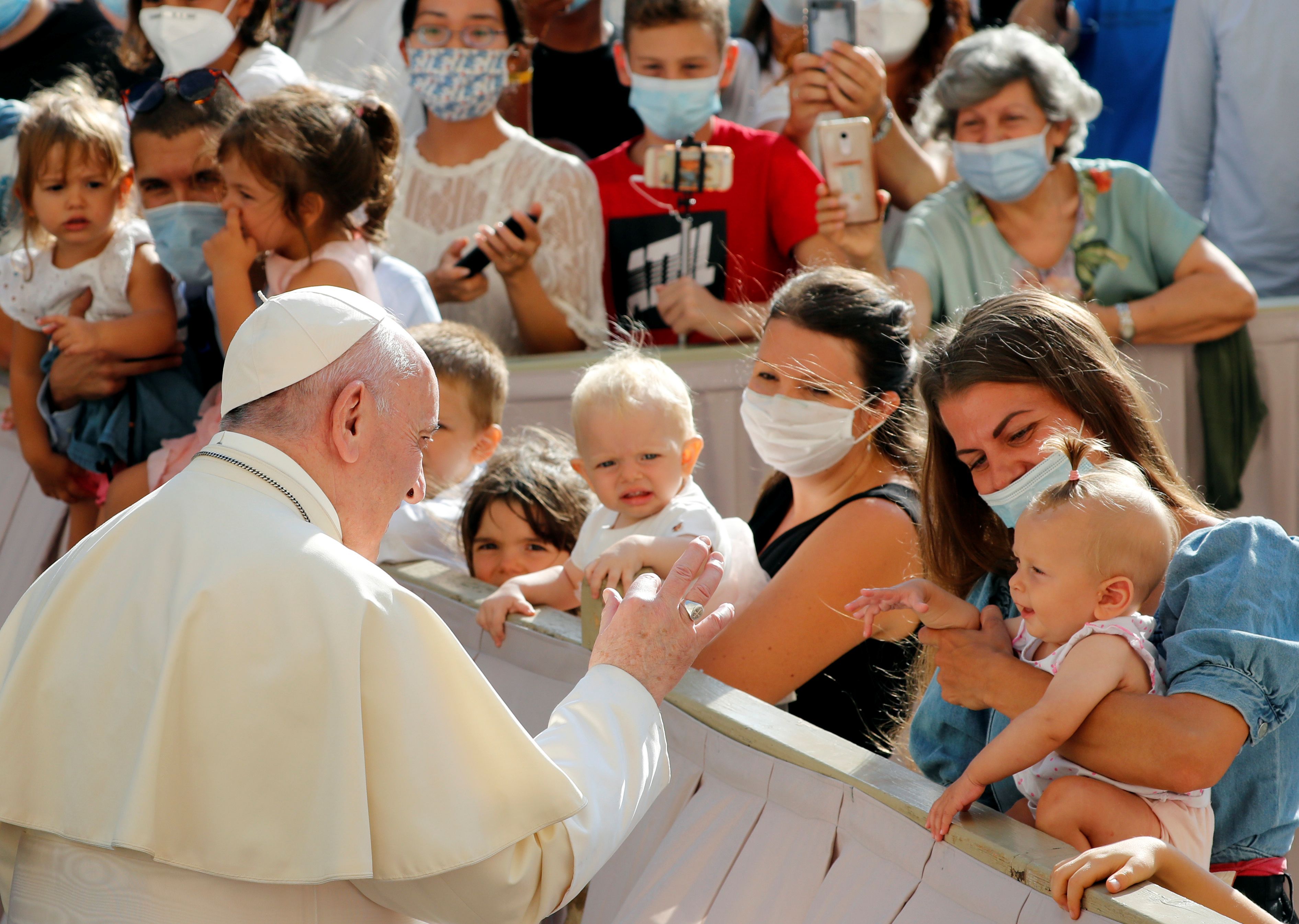 Después de quitarse la mascarilla, el papa se desinfectó las manos con gel con la ayuda de su asistente. Además evitó estrechar las manos y besar a los niños, como hacía en la inmensa plaza de San Pedro antes de la emergencia.