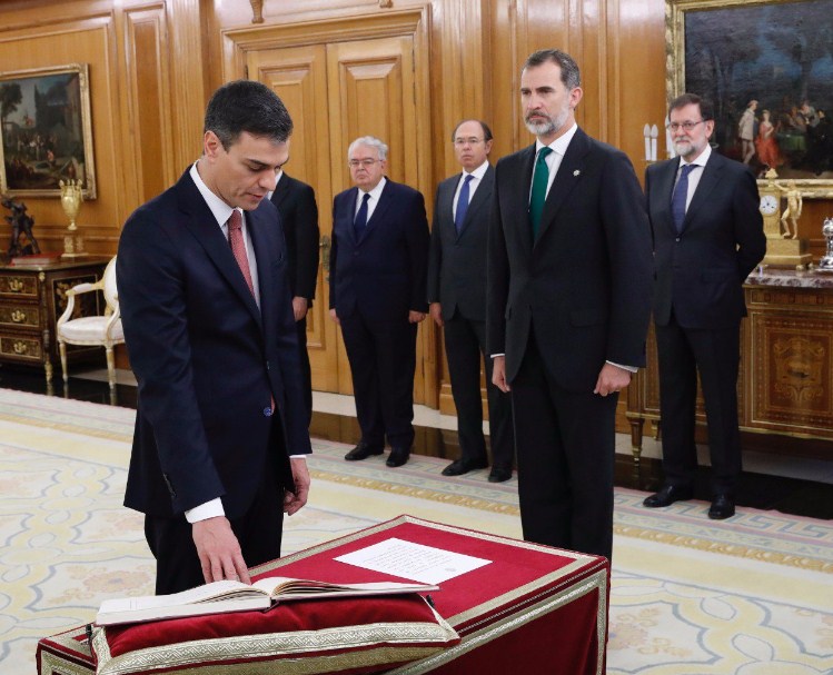 El socialista Pedro Sánchez asumió este sábado como presidente del gobierno de España tras prometer el cargo ante el rey Felipe VI en el Palacio de la Zarzuela de Madrid, al día siguiente de desbancar al conservador Mariano Rajoy con una histórica moción de censura.