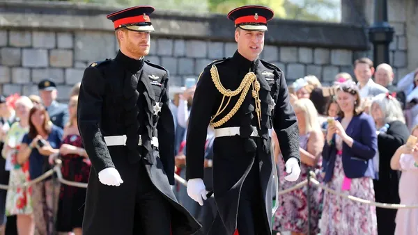 El novio principe Harry fue el centro de la atención en día de su gran boda. Los nietos de la Reina Isabel II arribaron según el cronograma en la flota real de la realeza británica,  que los dejo en a metros de la capilla de St George. Cómplices, Harry y William fueron caminando saludando a los miles de fanáticos que se acercaron. En sintonía, ambos vistieron similar.
