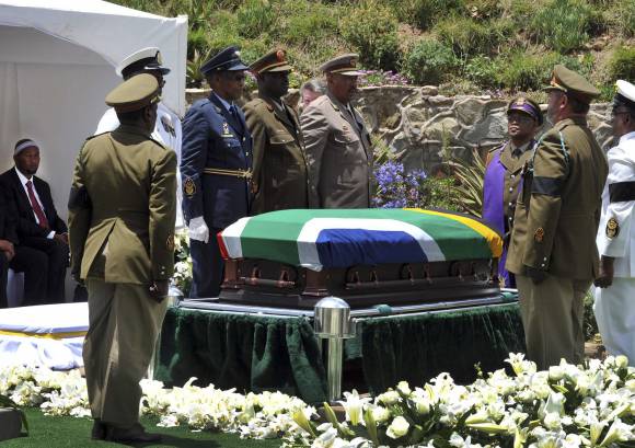 El entierro se produjo tras la conclusión de funeral, cuando el féretro de Mandela, cubierto con una bandera sudafricana, fue porteado en procesión por militares de alto rango, blancos y negros. Lo condujeron hacia la ladera de una pequeña colina situada en la finca de Mandela, en las mismas tierras en las que pasó su infancia, y el lugar que siempre consideró su hogar. Allí aguardaba con tristeza su familia, encabezada por su viuda, Graça Machel y su exesposa Winnie Mandela, esta vez sí, para dar su verdadero último adiós.