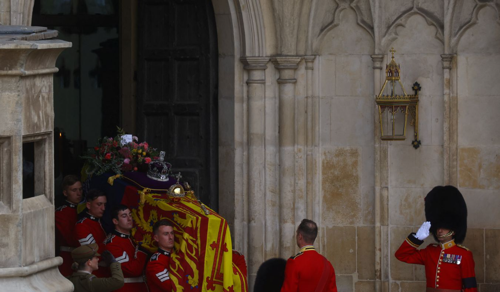 El ataúd de la monarca salió de la Abadía de Westminster al finalizar el servicio fúnebre y su féretro, envuelto en banderas y coronado por la Corona Imperial de Estado, fue trasladado de la iglesia nuevamente en el carruaje para dar comienzo a la procesión que la llevará a través de Londres hacia el Castillo de Windsor para un segundo servicio.