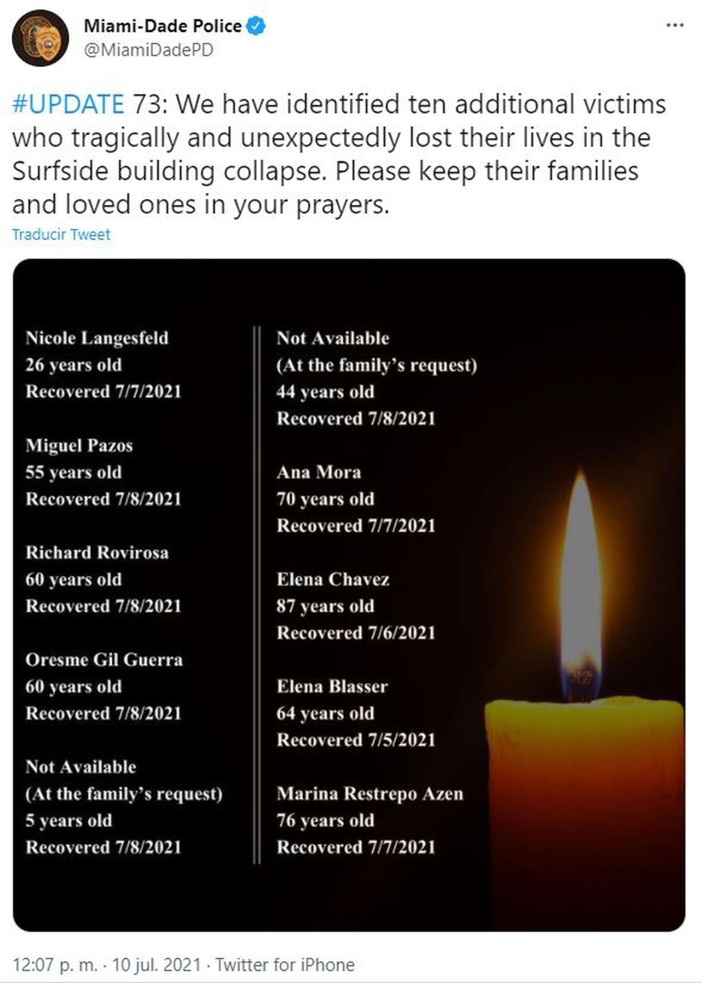 La alcaldesa de Miami-Dade, Daniella Levine Cava, indicó que la cifra provisional de muertos por el derrumbe se eleva a 86. y la de desaparecidos, en 43. “Este es un número asombroso y desgarrador que nos afecta a todos muy, muy profundamente. La magnitud de esta tragedia crece día a día”, manifestó la funcionaria.