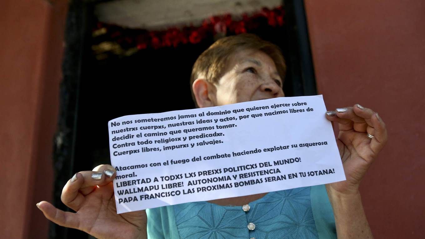 Uno de los ataques ocurrió en la comuna de Estación Central, en la parroquia Santa Isabel de Hungría. Desde el frontis incendiado rescataron un panfleto que amenaza a Jorge Bergoglio: “No nos someteremos jamás al dominio que quieren ejercer sobre nuestros cuerpos, nuestras ideas y actos, porque nacimos libres de decidir el camino que queramos tomar. Contra todo religiosx y predicador. Cuerpos libres, impurxs y salvajes. Atacaremos con el fuego del combate haciendo explotar su asquerosa moral. Libertad a todxs los presxs políticxs del mundo! Wallmapu libre! Autonomía y resistencia. Papa Francisco, las próximas bombas serán en tu sotana!”.