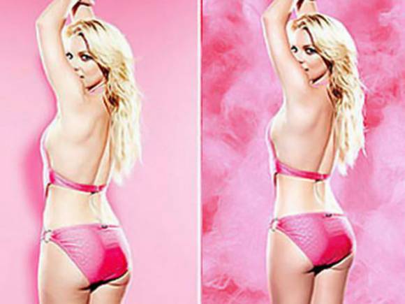 Estados Unidos, 20 de octubre.-A la izquierda, la imágen de Britney con celulitis y a la derecha, la imágen de Britney retocada. Así aparece la cantante en una campaña de concientización que la muestra antes y después de una sesión de Photoshop.
