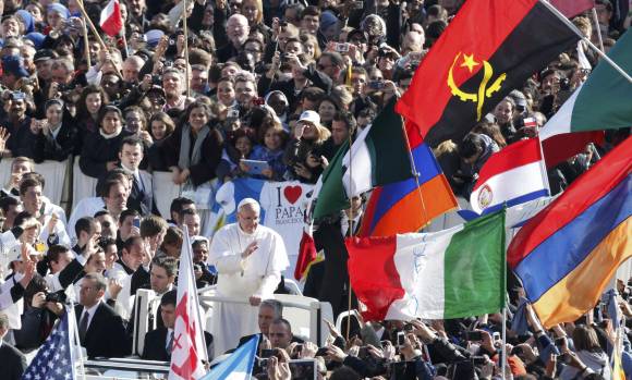Ante una multitud de emocionados seguidores de todo el mundo, el pontífice entró en la plaza vaticana a las 8.50 horas local (04.50 de Argentina) en un jeep blanco, en medio de los aplausos y viva de los miles de fieles presentes y el ondear de cientos de banderas, entre ellas muchas argentinas, y pancartas de movimientos eclesiales y otras de bienvenida, como ‘Estamos contigo‘.