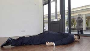 La figura, de gran parecido con Ai Weiwei, vestida con un traje y tendida en el suelo boca abajo, puede verse en "Laden Nr.5", un local comercial que da a la calle y que el centro artístico Palacio Balmoral reconvirtió recientemente en un pequeño espacio para exposiciones.