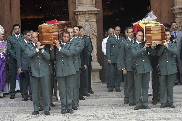 Escenas de dolor y rabia se vivieron más tarde en el funeral de los guardias civiles fallecidos que presidieron los príncipes de Asturias, Felipe y Leticia, en la catedral de Palma de Mallorca, al que asistieron autoridades locales y políticos del gobierno y la oposición.