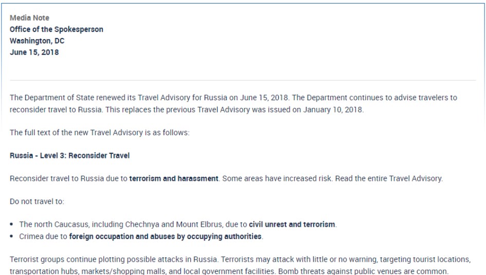 El Departamento de Estado manifestó a través de un comunicado en su página web que “aunque la seguridad para la Copa del Mundo será extensa, puede que los terroristas intenten atacar estadios, las zonas Fan Fest, sitios turísticos, centros de transporte y otros lugares públicos”. Y aseguró que estos grupos planean posibles atentados en Rusia más allá del Mundial.