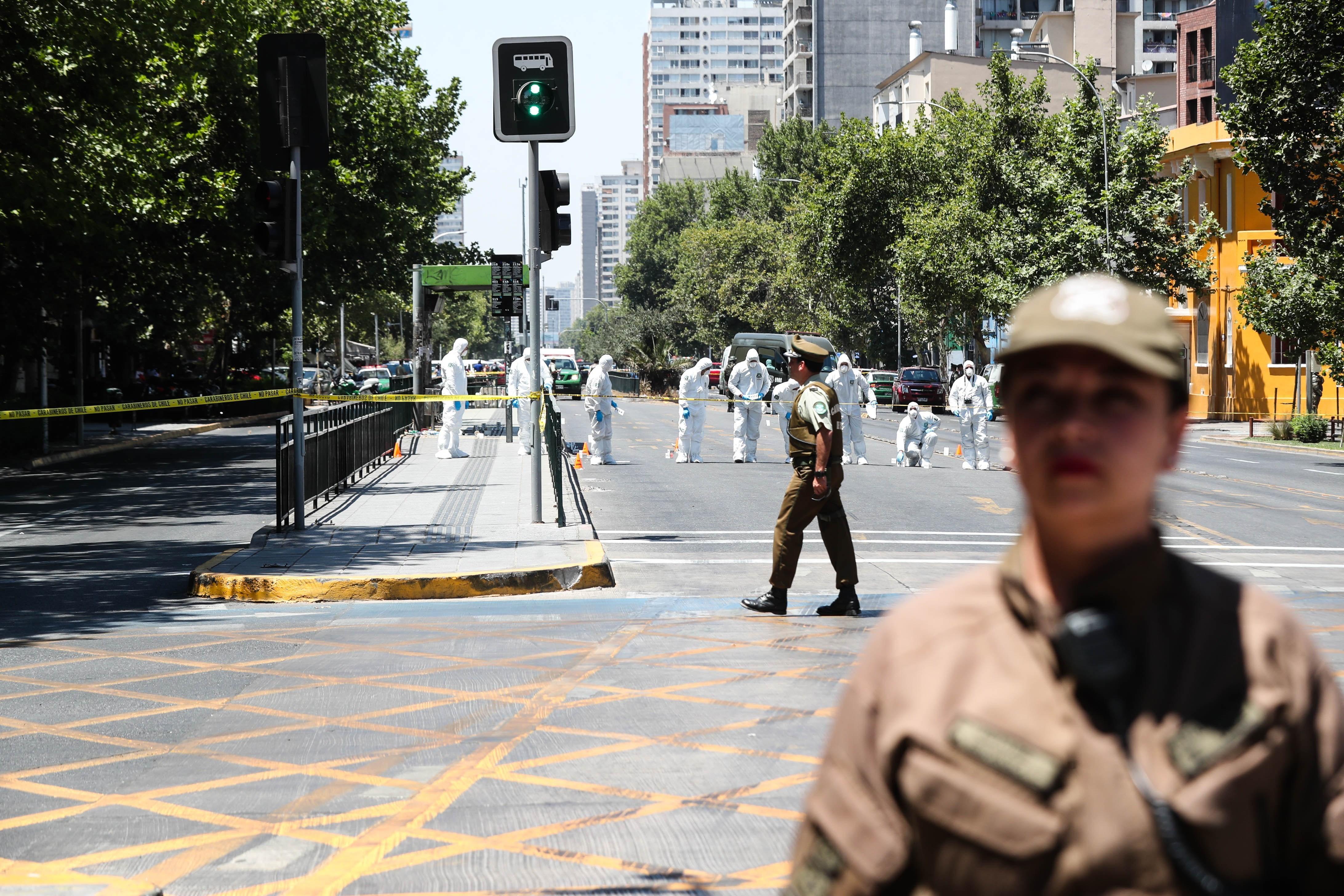 El general de Carabineros Enrique Monrás dijo a la prensa que el artefacto explosivo estaba en la parada de autobuses y que "hay una persona que lo manipula, explota y lesiona a cinco personas".