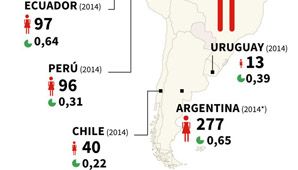 Argentina, sin estadísticas oficiales, aventaja a varios países de Sudamérica: 277 femicidios en 2014, cifra sin embargo inferior a los 295 de 2013, según la ONG Casa del Encuentro.