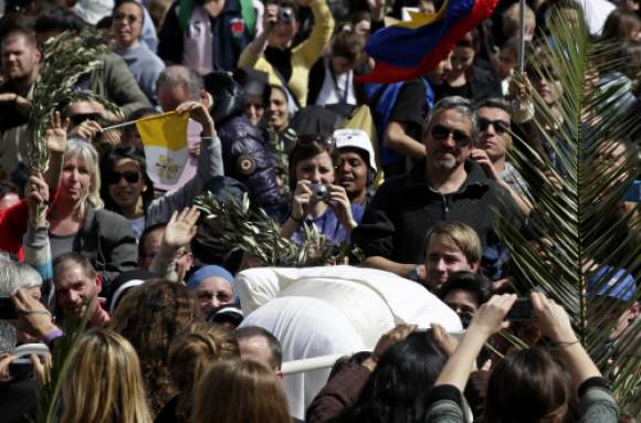 Al finalizar la misa, Francisco recorrió plaza San Pedro en un jeep blanco y bendijo a la miles de peregrinos, muchos con banderas argentinas y brasileñas, que eufóricos lo esperaban agitaban ramos de olivo y pañuelos. Con la bendición del Domingo de Ramos, Francisco inició los ritos de Semana Santa. Fuente: DyN, Télam.