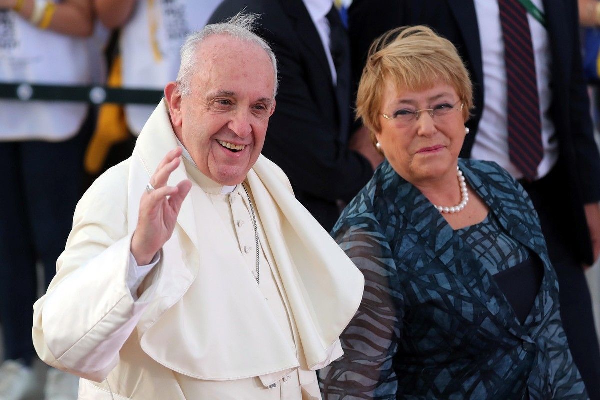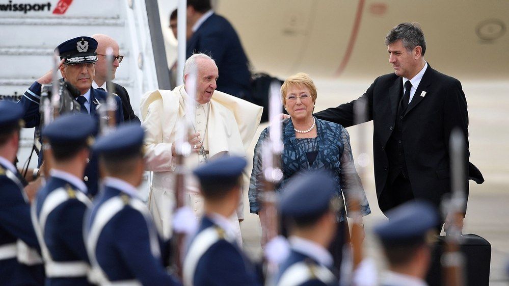 Pasadas las 19, hora local, una hora antes de lo previsto, el avión que trasladaba al papa Francisco arribó al aeropuerto internacional de Santiago. Allí, su Santidad fue recibido por la presidente Michelle Bachelet.
