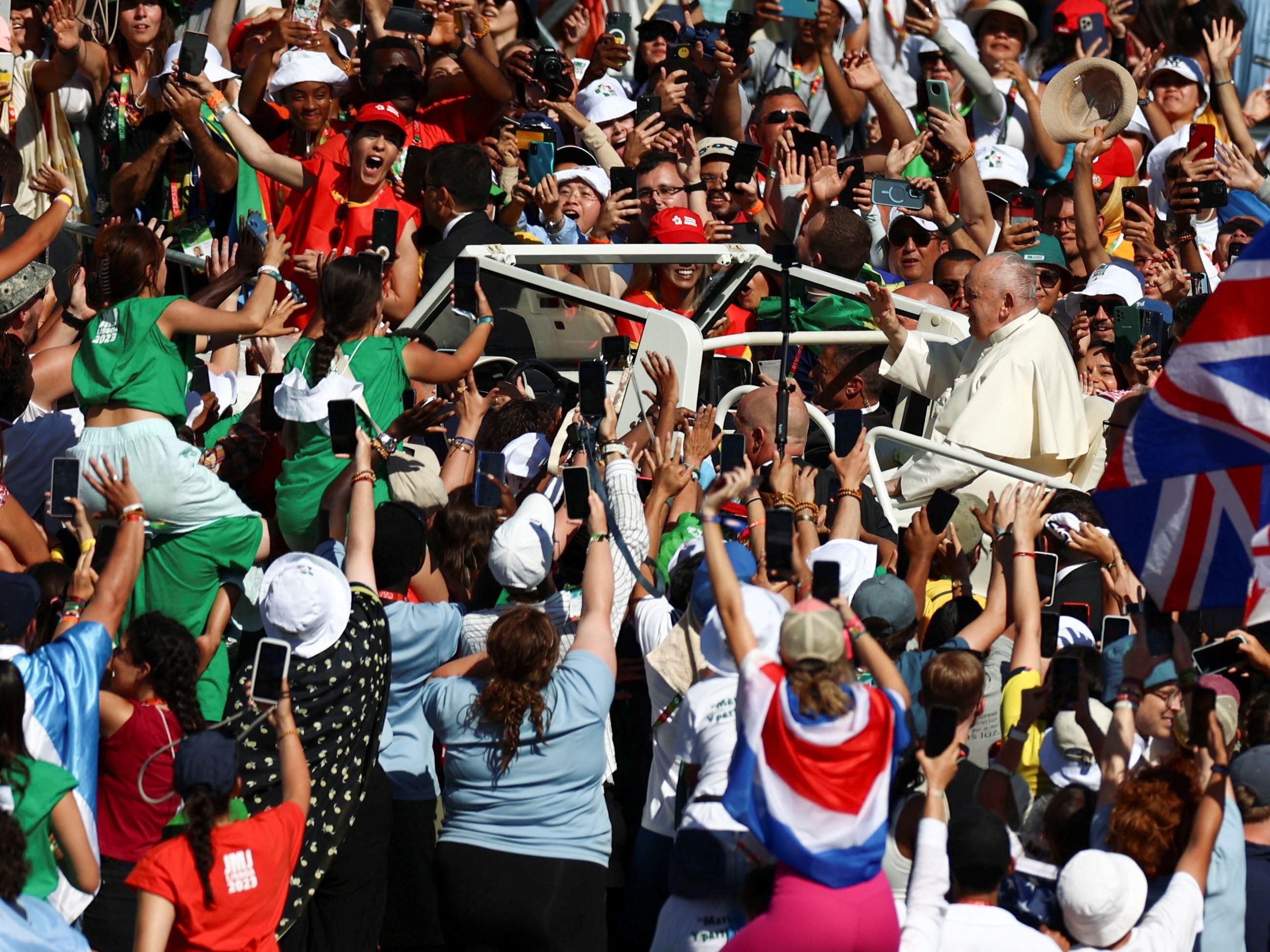 Además, el tradicional papamóvil con Jorge Bergoglio a bordo se abrió paso entre la colorida riada de fieles que lo esperaban ansiosos en un parque en el corazón de la capital de Portugal, tomada por la JMJ y el gran dispositivo de seguridad que rodea al pontífice. Luego el Papa los saludó desde un escenario.