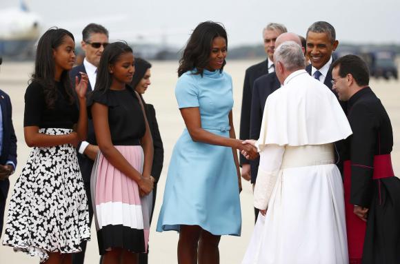 El santo padre aterrizó en la base aérea de Andrews (Maryland) a las 15.50 hora local (16.50 en Argentina). En una muestra de la importancia que la Casa Blanca asigna a la visita, el presidente de EEUU, Barack Obama, tomó la inusual decisión de llegar hasta la base aérea con su familia para recibir a Francisco. En la base, situada a unos 45 minutos en coche de Washington, lo recibieron Obama, y su esposa, Michelle, acompañados de sus hijas, Sasha y Malia.