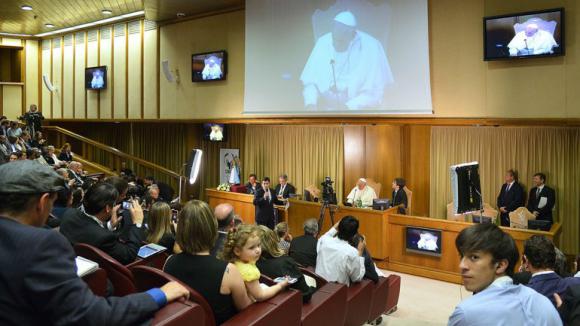En el Aula del Sínodo de los Obispos, el mismo escenario donde el todavía cardenal Jorge Bergoglio pronunció el discurso que le abrió el camino al papado, en marzo de 2013, había gran expectativa por la llegada de Francisco, quien cerraría con su presencia el tercer Congreso Mundial de Scholas Ocurrentes.
