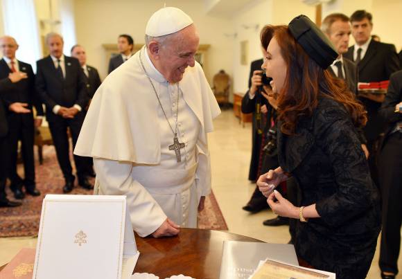 Aunque con retraso por el incidente, Fernández llegó finalmente a la cita entorno a la 13.10 hora de Roma. A las puertas de la residencia la esperaba ya el pontífice, quien se reunió en primer lugar durante veinte minutos con la delegación argentina, encabezada por el canciller, Héctor Timerman.