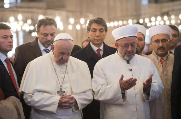 El papa Francisco visitó a su llegada a Estambul la Mezquita Azul junto al mufti (máxima autoridad religiosa) local, Rahmi Yaran, en un gesto que fue recogido por la prensa de todo el mundo, pues en el mihrab (muro orientado a La Meca, el lugar más sagrado del islam) inclinó la cabeza y unió sus manos. ‘La oración tiene muchas formas, porque es una relación con Dios y también puede ser silenciosa‘, dijo el portavoz vaticano. ‘Ahora resulta normal que un papa entre en una mezquita. La primera vez, con Juan Pablo II fue muy sorprendente; ahora es como un diálogo cada vez más normal, esto es positivo‘, agregó.