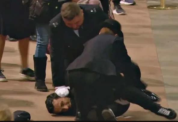 Los cientos de asistentes que pasaban en ese momento por el vestíbulo de Westminster, fueron testigos de cómo el sujeto se abalanzaba sobre el féretro de Isabel II, burlando no solo las medidas de seguridad, sino también a los 10 guardias reales que lo custodiaban con lanzas y otras armas propias del uniforme de gala.