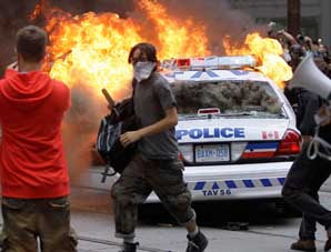 Canadá, 26 de junio.- Anarquistas vestidos de negro se enfrentaron con policías antidisturbios cerca del lugar de la cumbre de líderes mundiales en Toronto, Canadá, en la mayor manifestación en la semana de protestas contra las conversaciones del Grupo de las 20 (G-20) mayores economías desarrolladas y emergentes.