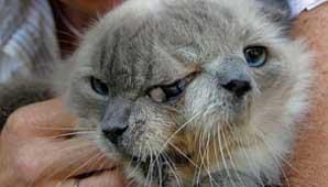 Su criador lo había llevado a la Escuela Cummings de Medicina Veterinaria, donde Stevens trabajaba en ese entonces, para que lo mataran. Él se sensibilizó por la historia del gato y se ofreció a llevárselo a su casa.