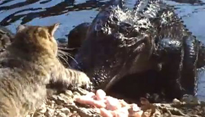 Estados Unidos, 24 de enero.- El curioso desafío ocurrió en un parque de Luisiana, EEUU. Tras un primer round de estudio el gato toma la iniciativa y el cocodrilo se retira al estanque.