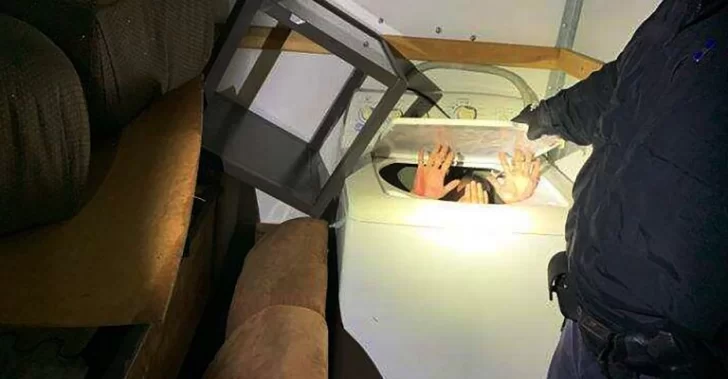 En las fotos proporcionadas por el ICE se puede ver a una persona metida dentro de un cofre de madera y a otras dos dentro de una lavadora, con las manos levantadas.