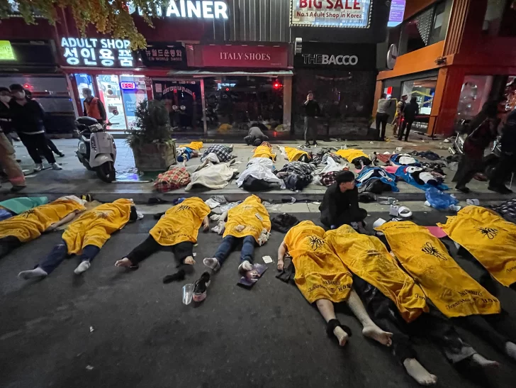 En otras imágenes grabadas por video, se puede ver unos 20 cuerpos recubiertos con mantas. Es la primera vez que se celebra Halloween en el país asiático desde el inicio de la pandemia de covid- 19 en 2020.