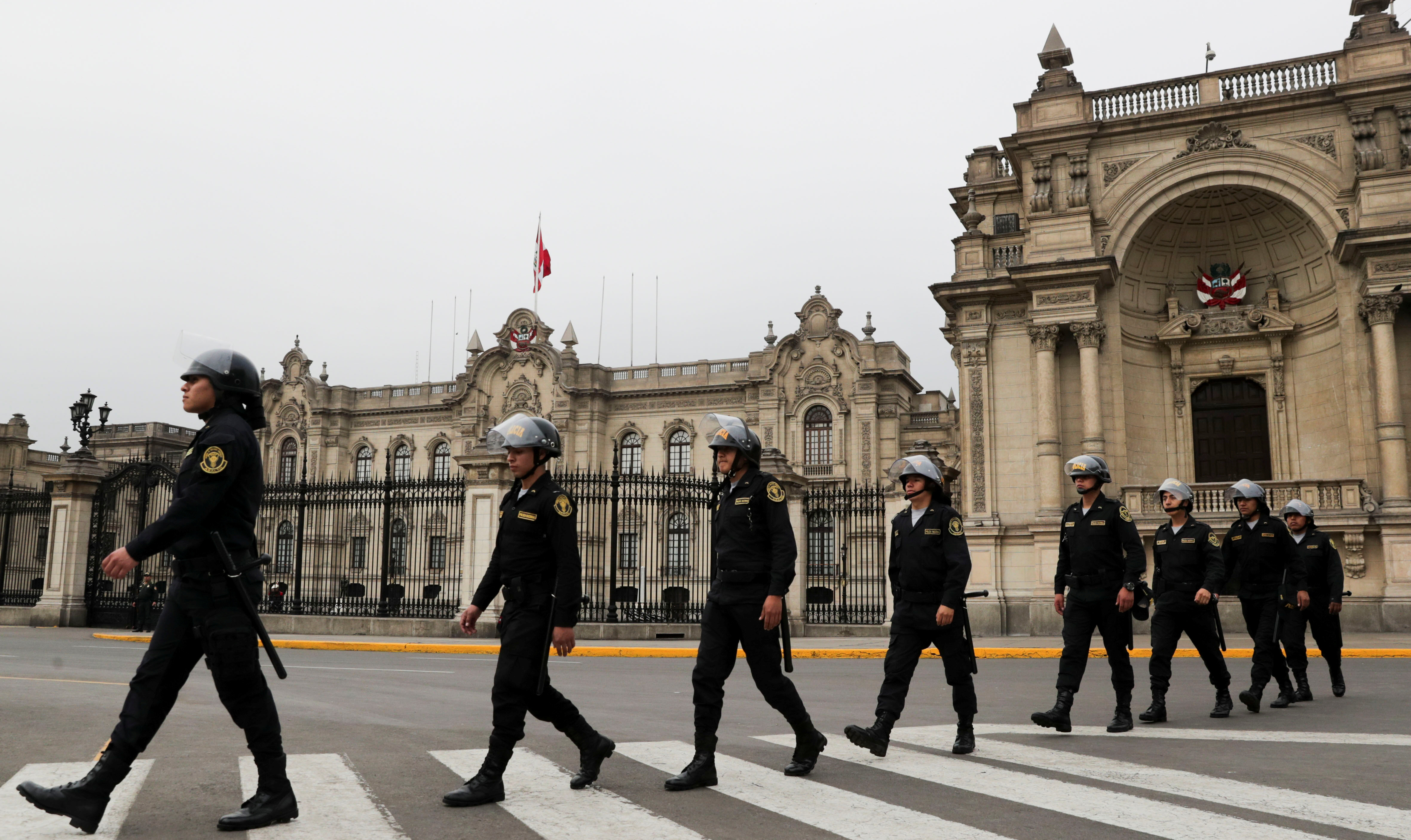 Un lugar clave. Efectivos policiales transitan en los alrededores del Palacio de Gobierno en Lima, la capital de Perú. Por la crisis, cayeron los mercados.