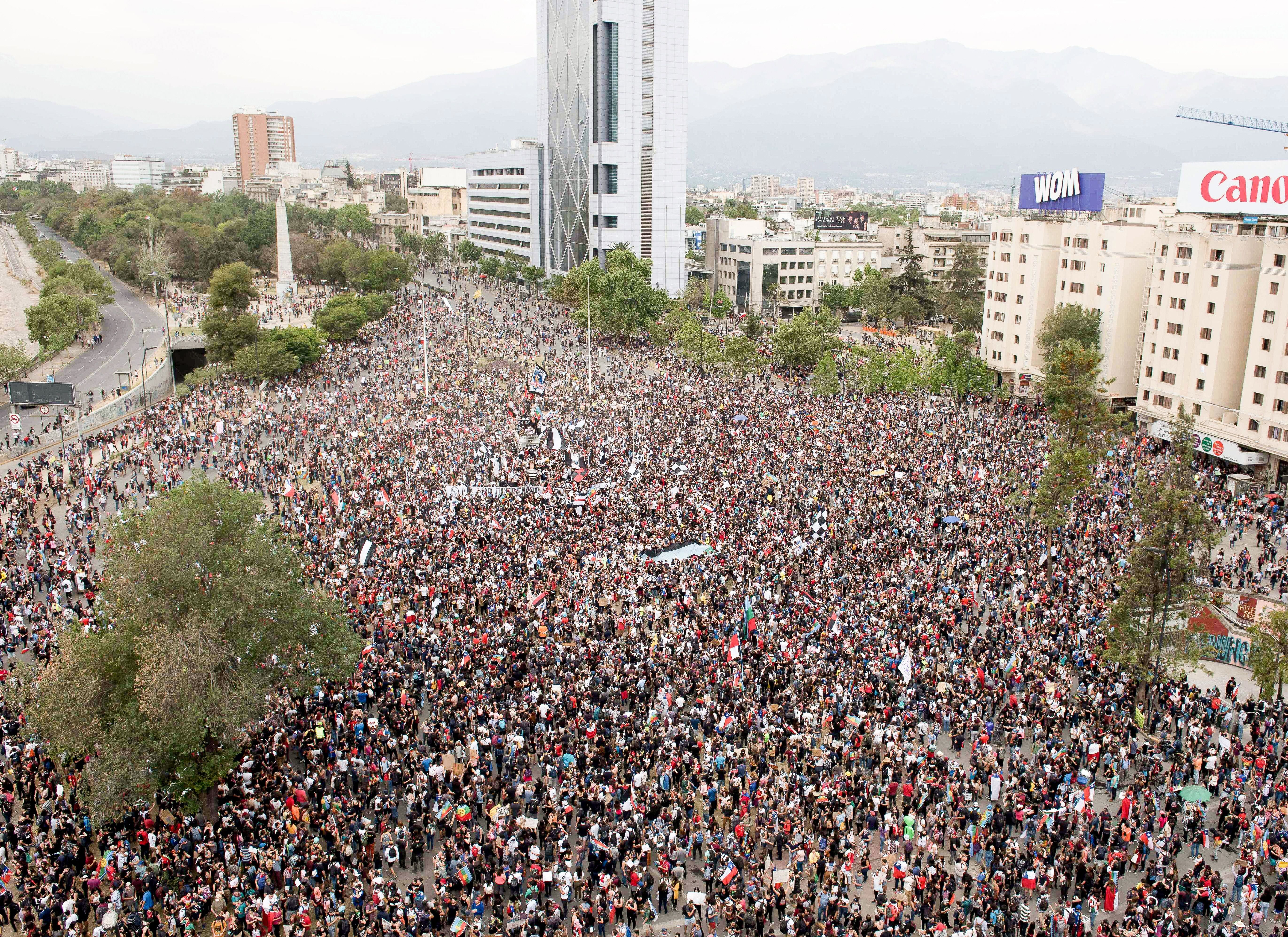 La muchedumbre rebosó el epicentro del descontento social para reclamar la salida del presidente Sebastián Piñera por la represión y presuntas violaciones de los derechos humanos cometidas por las fuerzas del orden contra los manifestantes en días anteriores.
