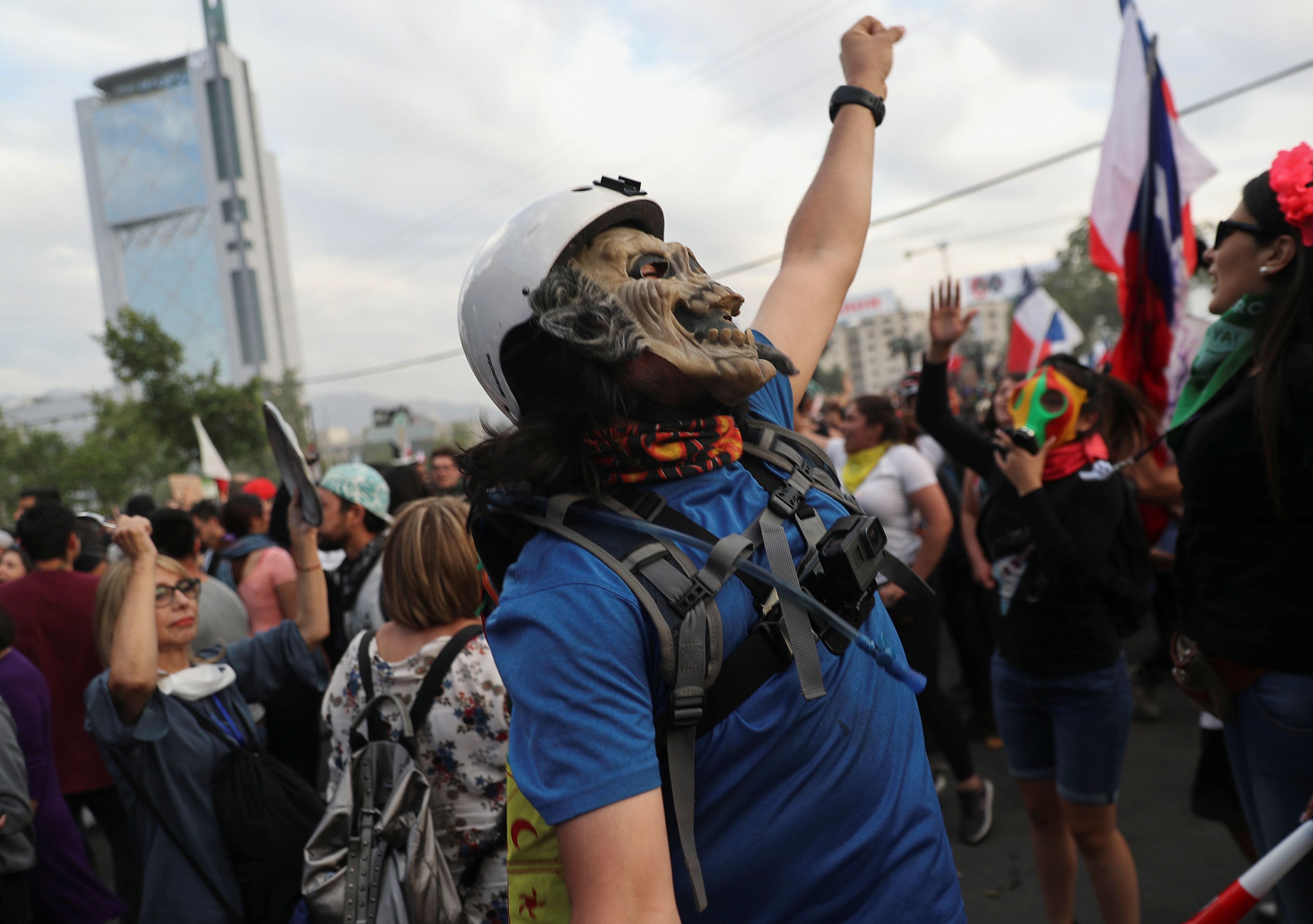 Entonando canciones populares durante la dictadura de Augusto Pinochet (1973-90), saltando y con banderas chilenas y mapuches, los manifestantes se congregaron en anchas avenidas de la capital para atender el llamado de la "Marcha más grande de Chile", una semana después de que uno de los países más estables de América latina quedara sumido en su peor crisis social.