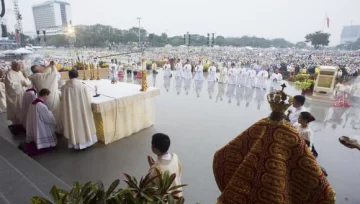 Algunos de los fieles pasaron la noche frente a las puertas, que se abrieron nueve horas antes de la misa. La ceremonia, celebrada en el único país asiático predominantemente católico, se prolongó durante tres horas.