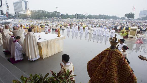 Francisco saludó a la multitud desde un papamóvil hecho a partir de los vehículos ‘yipnis‘ filipinos vestido con el mismo impermeable amarillo que se proporcionó a los asistentes. Se detuvo a lo largo del recorrido para besar a los niños y bendecir las estatuas religiosas en el día en que los filipinos celebran la fiesta del Niño Jesús.