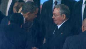 El encuentro se produjo cuando Obama se dirigía hacia el estrado del estadio Soccer City de Johannesburgo, donde se desarrolla el funeral del líder sudafricano. De esta manera, se pudo ver en directo por los canales de televisión el primer saludo público entre ambos mandatarios.