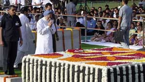 India, 2 de octubre.- El primer ministro indio, Manmohan Singh, la líder del gubernamental Partido del Congreso, Sonia Gandhi, y el líder opositor L.K. Advani depositaron coronas de flores. El lugar de encuentro fue el memorial capitalino dedicado a Mohandas Karamchand "Mahatma" Gandhi, donde había cientos de personas al cumplirse 142 años de su nacimiento.