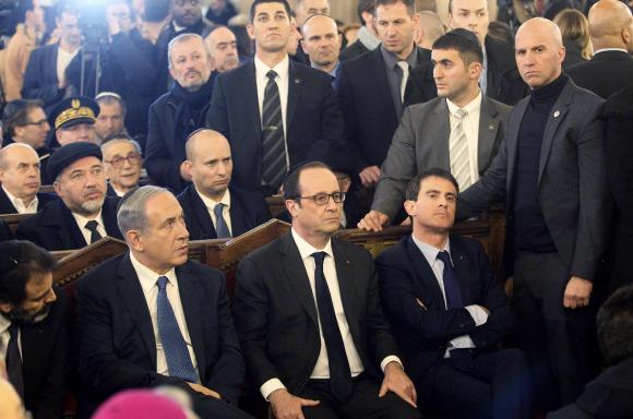 Poco después de caer la noche, el presidente francés, Francois Hollande, y el primer ministro israelí, Benjamin Netanyahu entraron a la Gran Sinagoga, que se encuentra a unas 20 cuadras al Noroeste de la Plaza de la República, epicentro de la marcha nacional de ayer, y fueron recibidos con una ovación, según el diario local Le Monde.