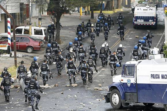 Policías y militares dispersaron con gases lacrimógenos, carros lanza agua y una antena que emitía un sonido ensordecedor a los manifestantes, que se defendieron con piedras en enfrentamientos que dejaron decenas de heridos y detenidos.