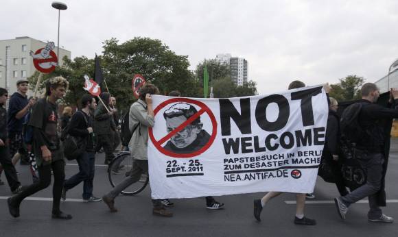 En este marco, miles de personas (opositores, homosexuales, víctimas de abusos sexuales y católicos críticos) se manifestaron contra la visita. “Estamos contra la falsa moral sexual vaticana”, comentó a Efe Wiltrud Schenk, de 65 años y disfrazada de preservativo color lila, mientras que Eckhard, de 62 años, que denunciaba las violaciones en orfanatos, aseguró: “Las disculpas protocolarias no borrarán los 14 años de abusos sexuales sufridos como monaguillo”.