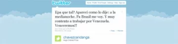 Buenos Aires, 28 de abril.- Según el diairo El Mundo, el primer Twitter de Chávez fue: "Epa que tal? Aparecí como lo dije: a la medianoche. Pa Brasil me voy. Y muy contento a trabajar por Venezuela. Venceremos!!"