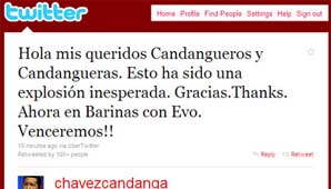 El anuncio de la entrada de Chávez en el mundo de las nuevas plataformas digitales lo hizo su jefe de comunicaciones Diosdado Cabello a través de su propia cuenta en Twitter. "Camaradas, @chavezcandanga se ha reservado, pronto tendremos allí mensajes de nuestro ’Comandante’", rezaba el ’tweet’ de Cabello.