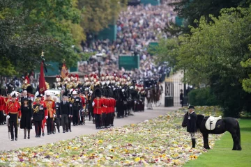 El ataúd de la monarca salió de la abadía tras el servicio fúnebre, envuelto en banderas y coronado por la Corona Imperial de Estado, y fue trasladado a un afuste -un carro para cañones- tirado por decenas de marineros, para dar comienzo a la procesión que la llevó a través de Londres hacia el castillo de Windsor, a unos 40 kilómetros.