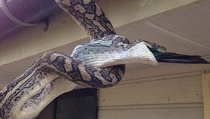 Australia.- Las fotografías grafican el momento exacto en que una pitón devora un papagayo de gran tamaño en la ciudad costera de Agnes Waters, en Australia. Las imágenes fueron enviadas por el dueño de casa a Stuart McKenzie, un cazador de serpientes que se dedica a recorrer el país en busca de los ejemplares más raros y grandes.