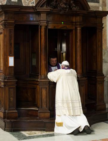 El papa Francisco acudió ayer a uno de los confesionarios de la Basílica de San Pedro del Vaticano para confesarse, de rodillas, junto a los demás fieles, durante el Rito de la Reconciliación que ofició en el templo, previo al cuarto domingo de Cuaresma. Un gesto inédito en tiempos recientes.
