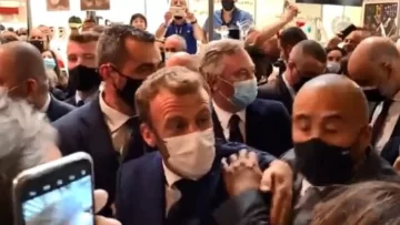 Cuando Macron recorría los pasillos de la feria, un huevo impactó en su hombro, aunque sin llegar a romperse. El autor del lanzamiento fue detenido y esposado.