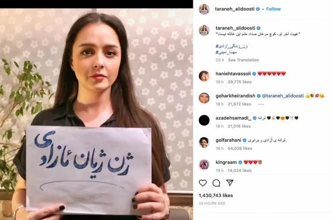 "Su nombre era Mohsen Shekari. Todas las organizaciones internacionales que ven este baño de sangre y no hacen nada son una verguenza para la humanidad", escribió Alidoosti. Según los medios iraníes, fue arrestada por no haber podido entregar "documentos que prueben sus reclamos". Su cuenta de Instagram, que tenía unos ocho millones de seguidores, fue suspendida desde entonces.