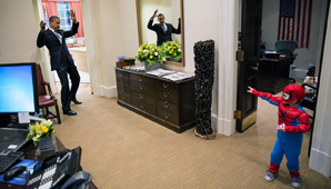 La imagen tomada por el fotógrafo Peter Souza muestra a Obama simulando ser atrapado por la tela araña lanzada por un mini súper héroe. La foto habría sido tomada en Halloween, y el niño sería el hijo de un miembro del equipo del presidente, posiblemente de un ministro.