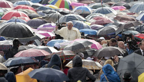 Buenos Aires, 9 de octubre.- En otro de sus gestos nobles que han revolucionado al mundo desde su llegada al Vaticano a comienzos del año, el papa Francisco se mantuvo durante una hora bajo la lluvia para saludar a las decenas de miles de fieles que se habían congregado para saludarlo en la Plaza de San Pedro.