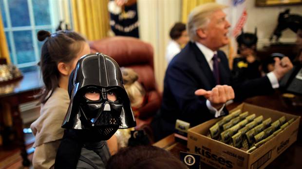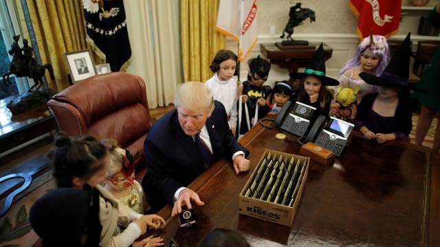 Trump fue visitado en su despacho por un grupo de hijos de periodistas que, ansiosos y vestidos como Batman, la princesa Leila, brujas, Darth Vader y demás personajes de ficción, esperaban recibir un saludo y las famosas golosinas que se entregan en Halloween.